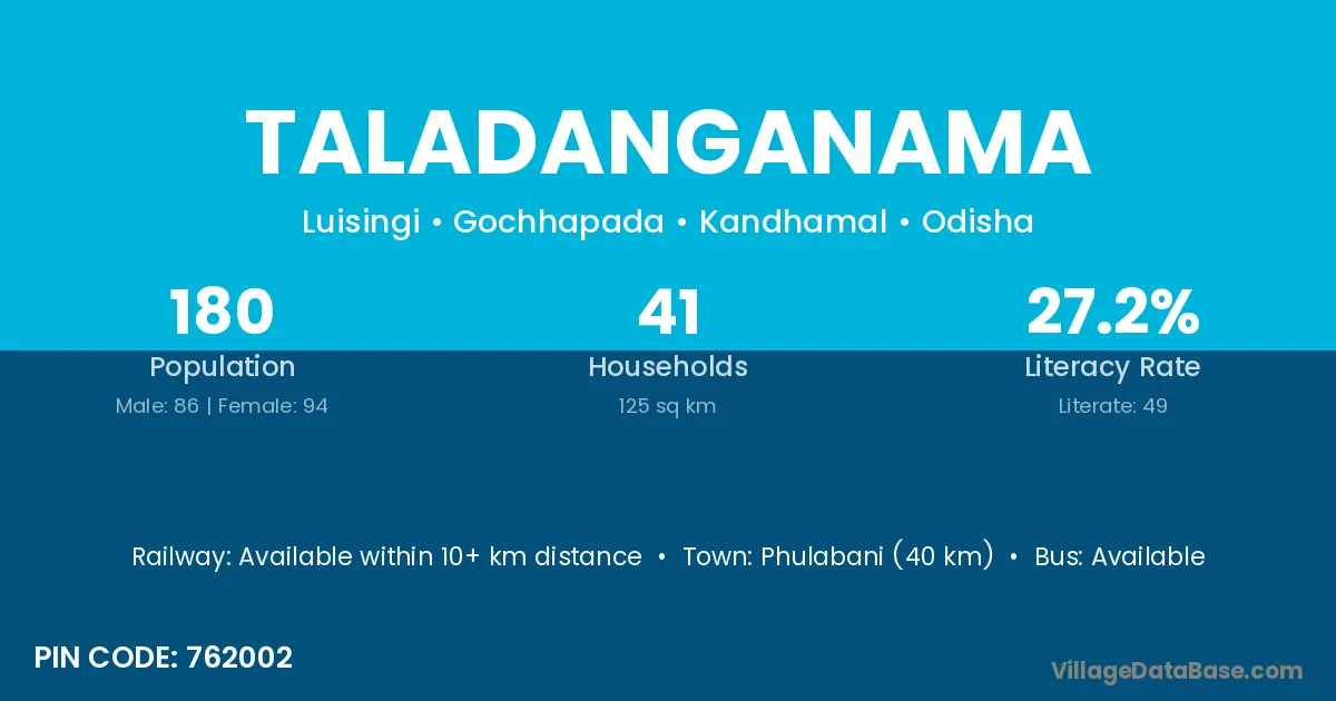 Phulabani (40 km) is the nearest town to Taladanganama village for major economic activities and is located approximately 40 km away.