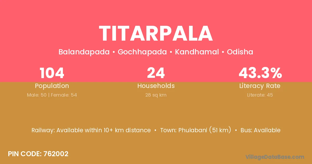 Phulabani (51 km) is the nearest town to Titarpala village for major economic activities and is located approximately 51 km away.