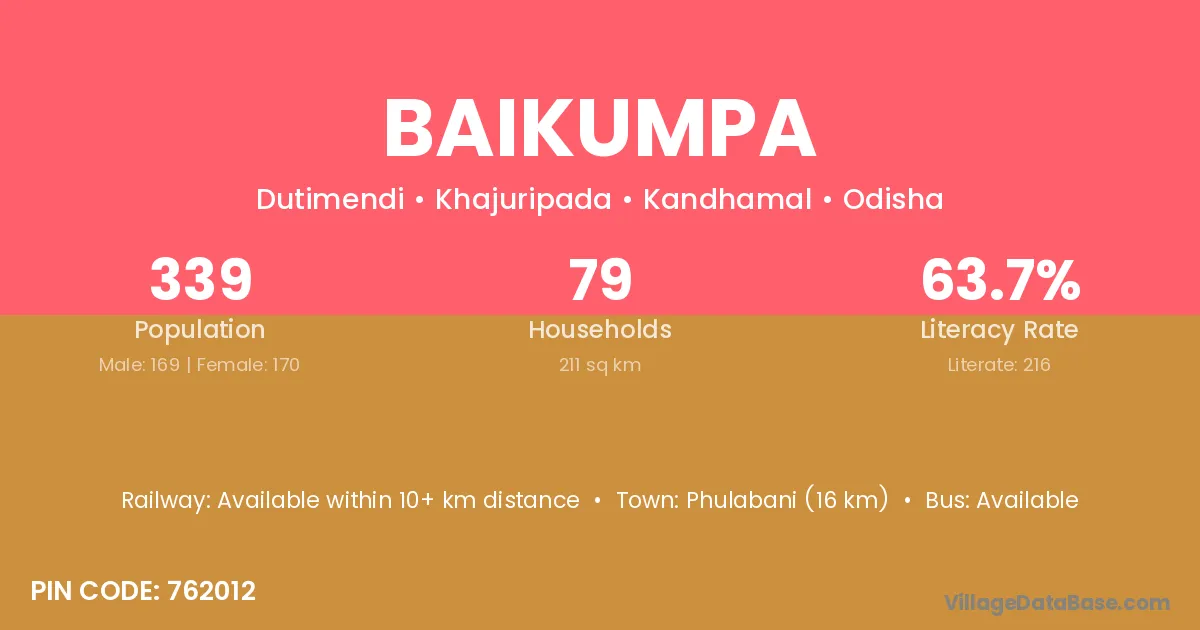 Phulabani (16 km) is the nearest town to Baikumpa village for major economic activities and is located approximately 16 km away.