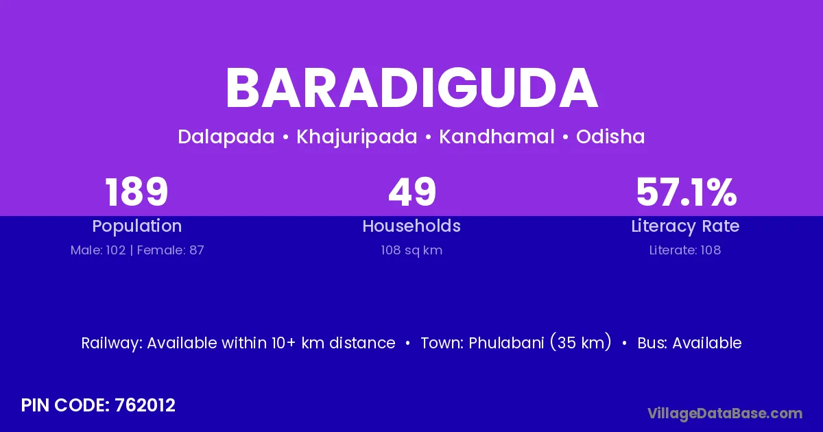 Phulabani (35 km) is the nearest town to Baradiguda village for major economic activities and is located approximately 35 km away.