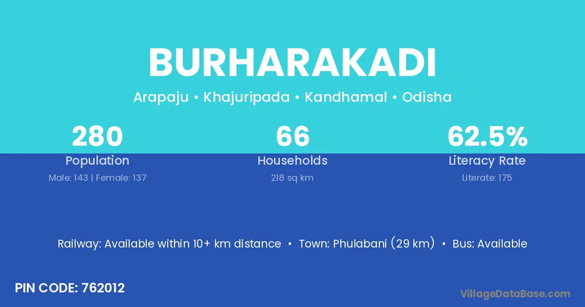 Phulabani (29 km) is the nearest town to Burharakadi village for major economic activities and is located approximately 29 km away.