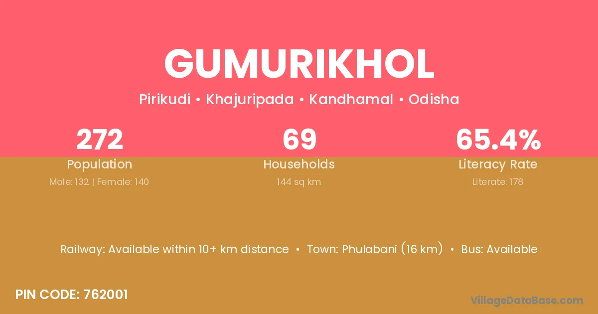 Phulabani (16 km) is the nearest town to Gumurikhol village for major economic activities and is located approximately 16 km away.