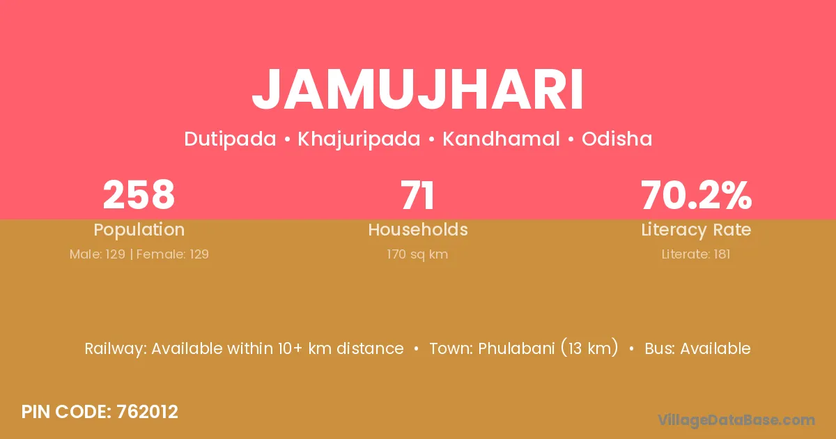 Phulabani (13 km) is the nearest town to Jamujhari village for major economic activities and is located approximately 13 km away.