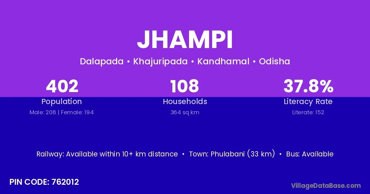 Phulabani (33 km) is the nearest town to Jhampi village for major economic activities and is located approximately 33 km away.