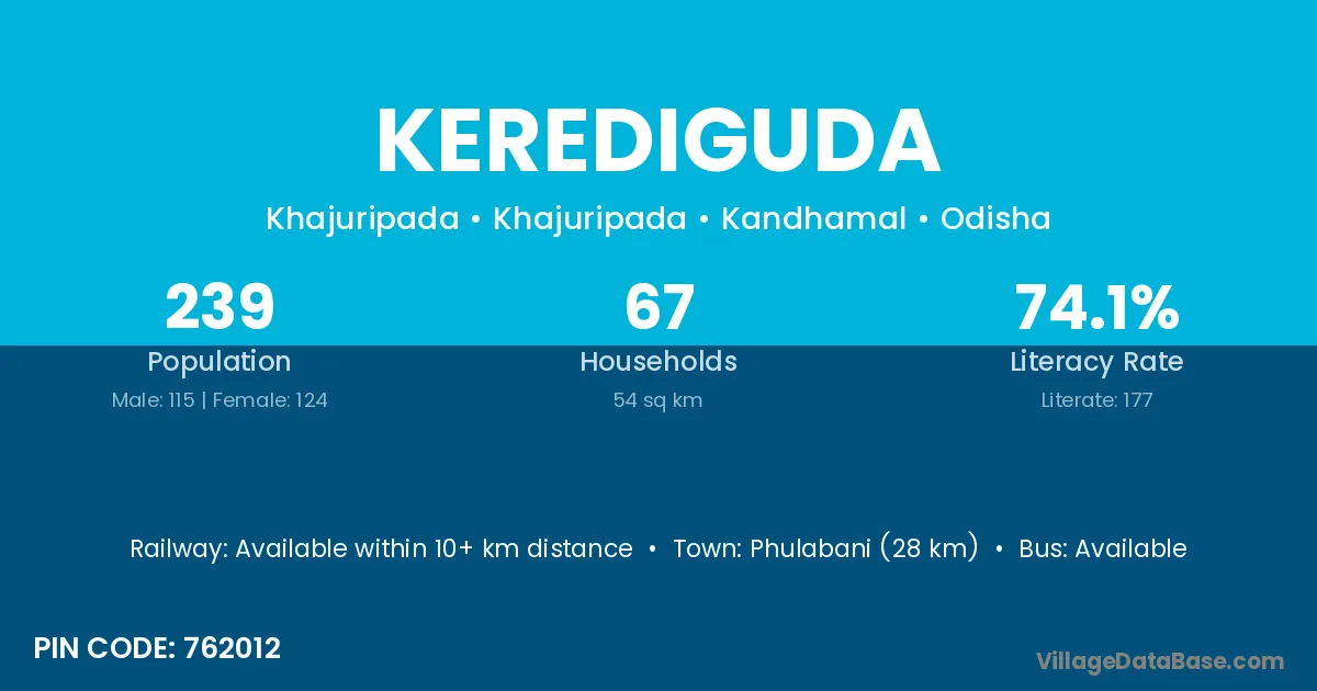 Phulabani (28 km) is the nearest town to Kerediguda village for major economic activities and is located approximately 28 km away.