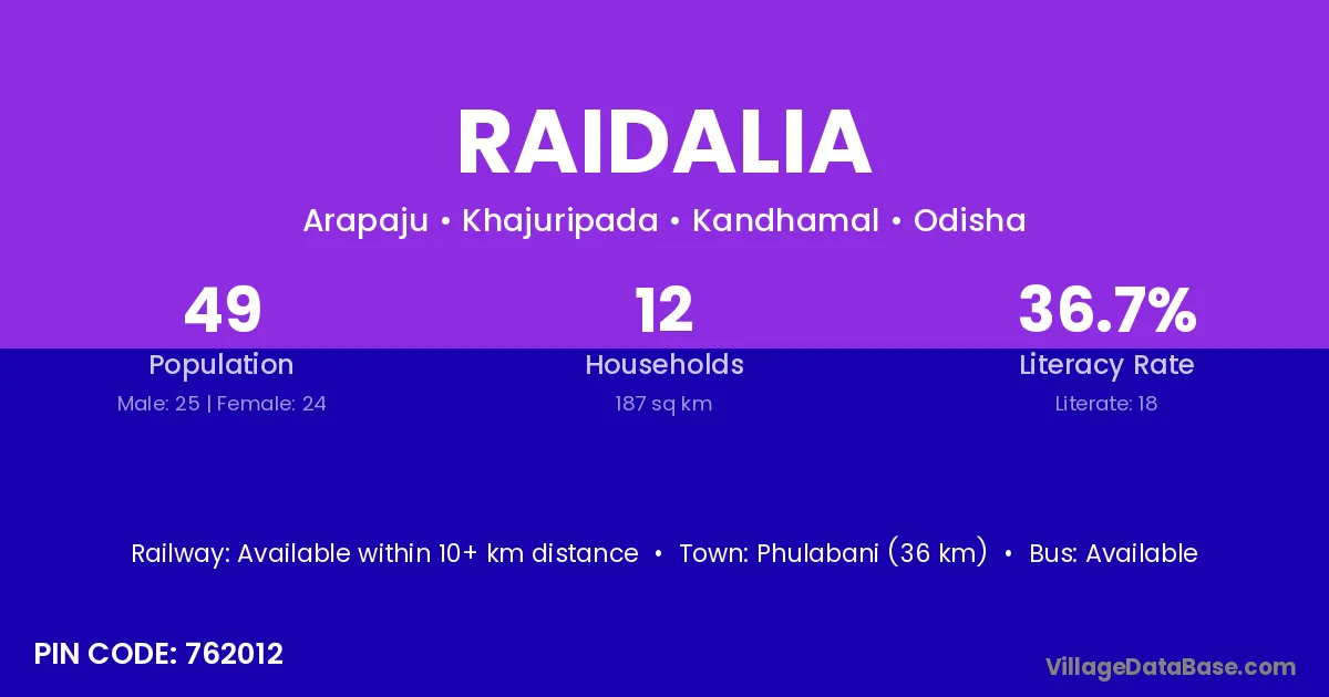 Phulabani (36 km) is the nearest town to Raidalia village for major economic activities and is located approximately 36 km away.