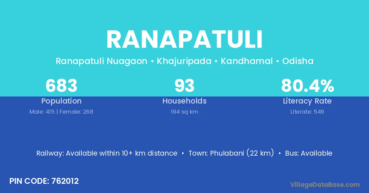 Phulabani (22 km) is the nearest town to Ranapatuli village for major economic activities and is located approximately 22 km away.