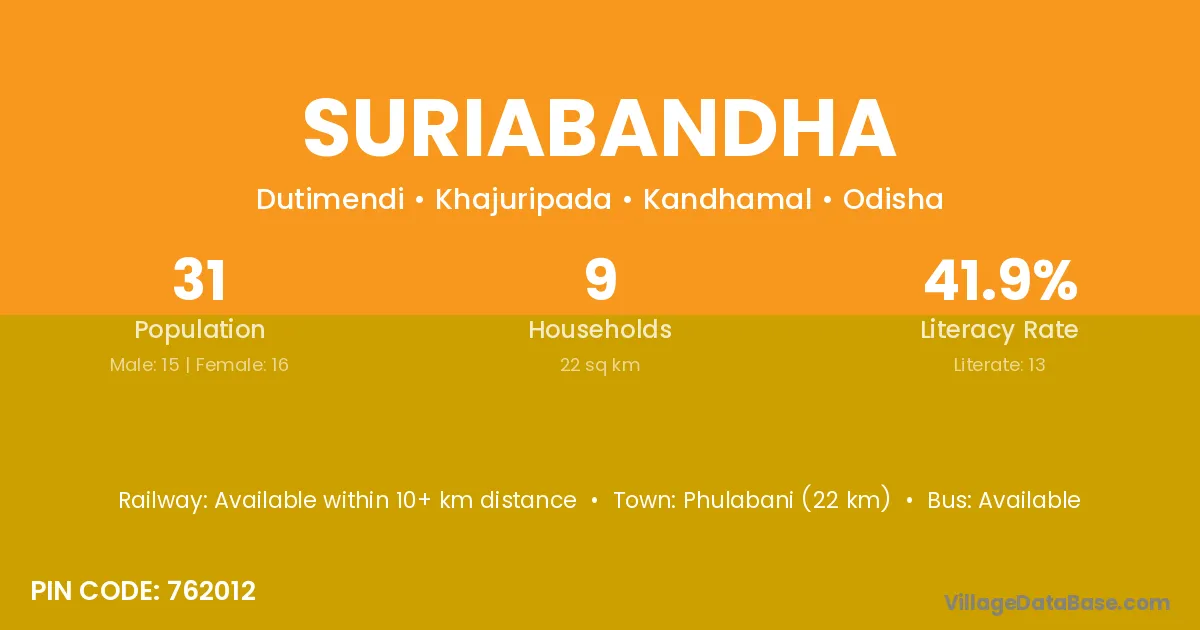 Phulabani (22 km) is the nearest town to Suriabandha village for major economic activities and is located approximately 22 km away.
