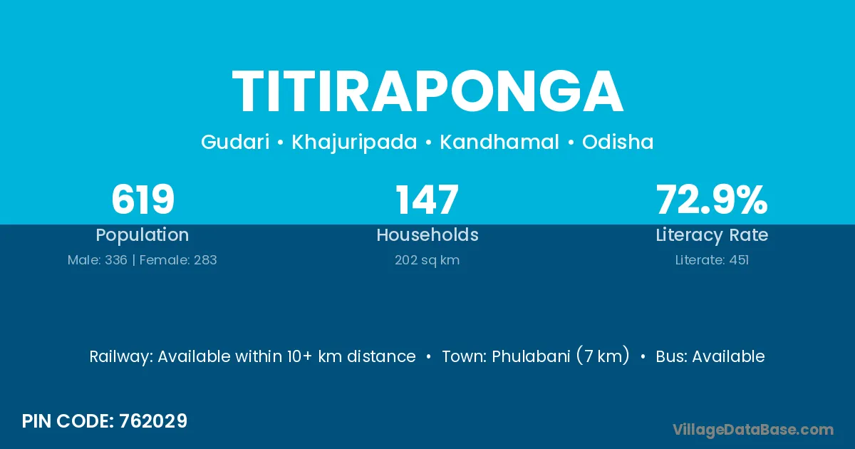 Phulabani (7 km) is the nearest town to Titiraponga village for major economic activities and is located approximately 7 km away.