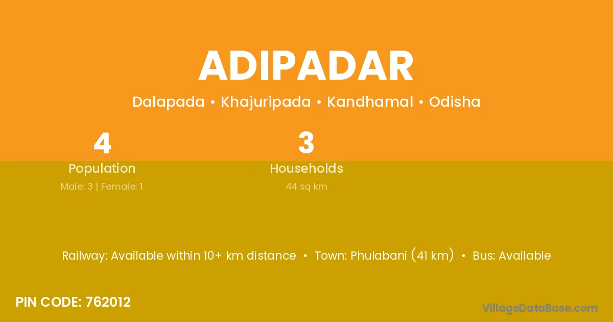Rayagada (120 km) is the nearest town to Adipadar village for major economic activities and is located approximately 120 km away.
