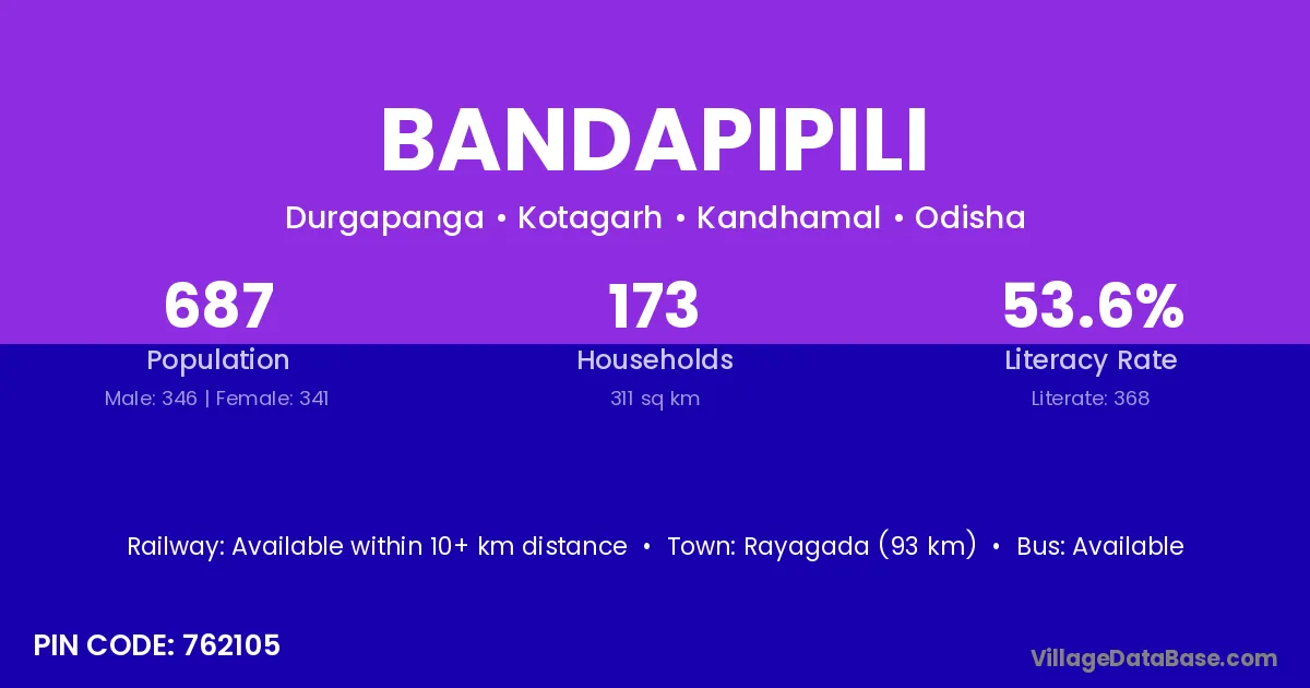 Rayagada (93 km) is the nearest town to Bandapipili village for major economic activities and is located approximately 93 km away.