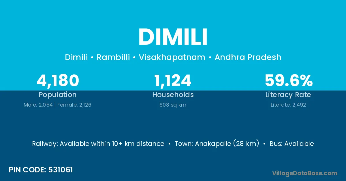 The literacy rate of Dimili village is 43.57%. Male literacy stands at 45.07% and female literacy at 42.03%.