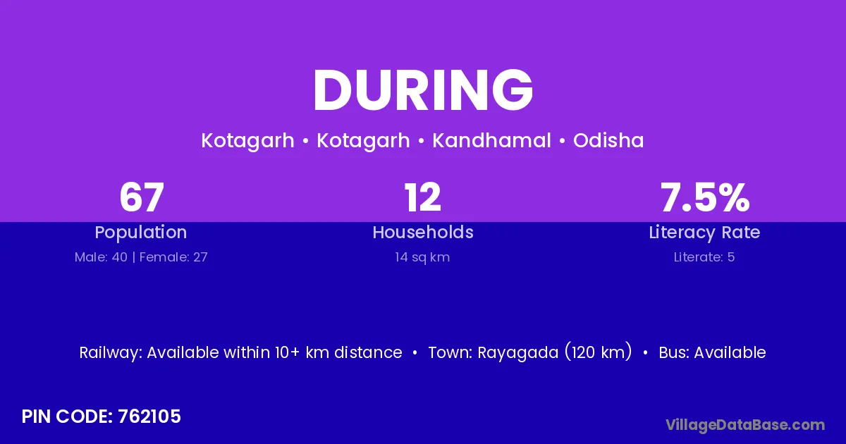 Rayagada (120 km) is the nearest town to During village for major economic activities and is located approximately 120 km away.