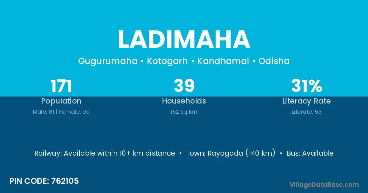 Rayagada (140 km) is the nearest town to Ladimaha village for major economic activities and is located approximately 140 km away.
