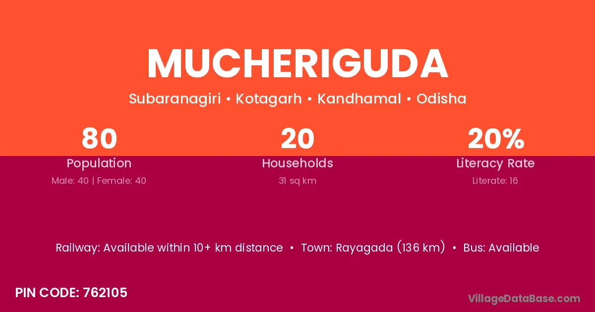 Rayagada (136 km) is the nearest town to Mucheriguda village for major economic activities and is located approximately 136 km away.