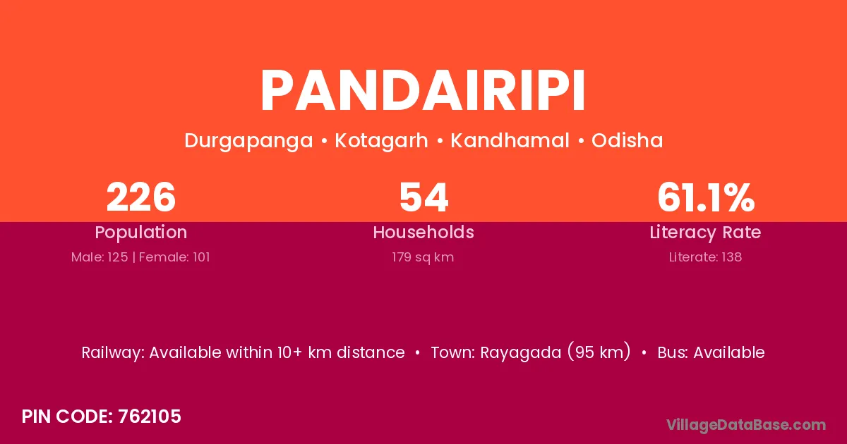Rayagada (95 km) is the nearest town to Pandairipi village for major economic activities and is located approximately 95 km away.