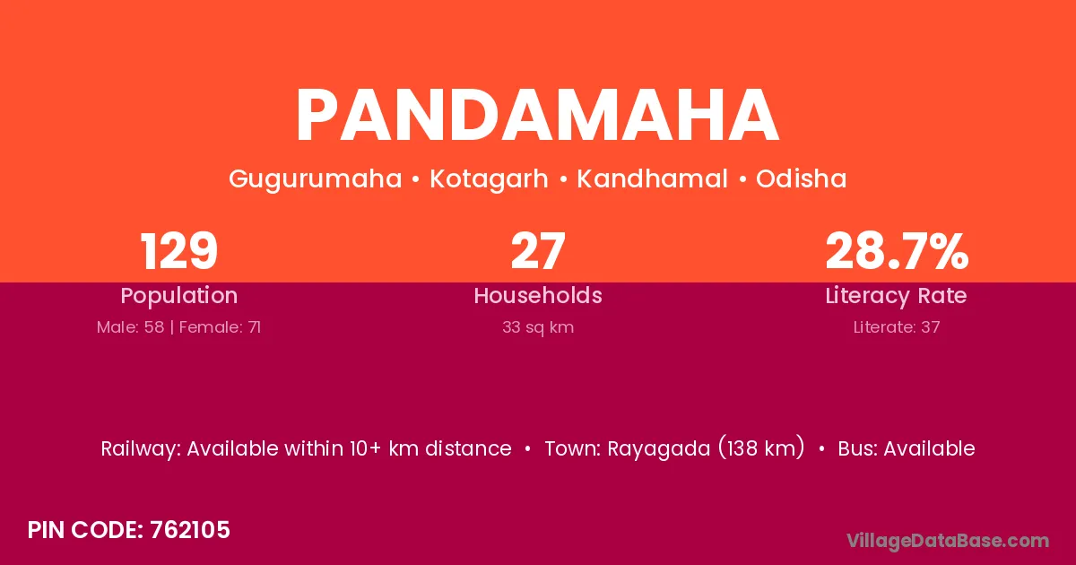 Rayagada (138 km) is the nearest town to Pandamaha village for major economic activities and is located approximately 138 km away.