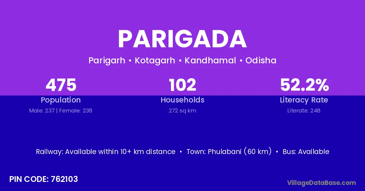 Phulabani (60 km) is the nearest town to Parigada village for major economic activities and is located approximately 60 km away.