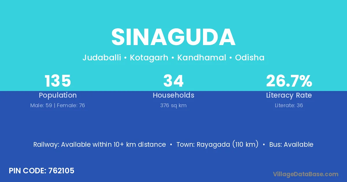 Rayagada (110 km) is the nearest town to Sinaguda village for major economic activities and is located approximately 110 km away.