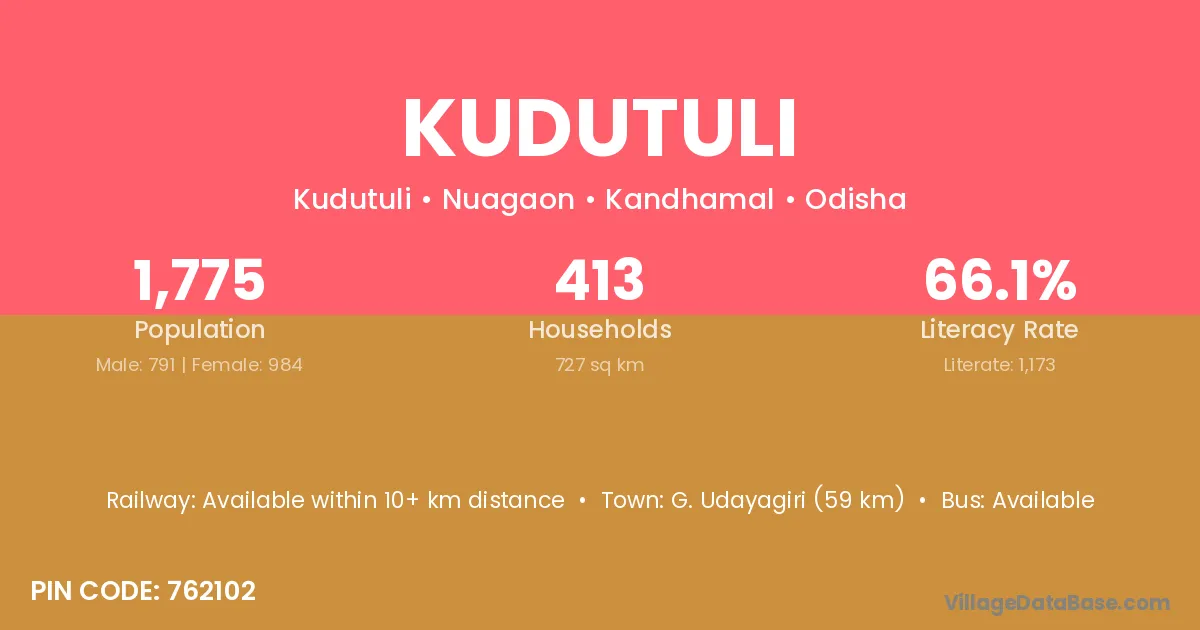 G. Udayagiri (59 km) is the nearest town to Kudutuli village for major economic activities and is located approximately 59 km away.