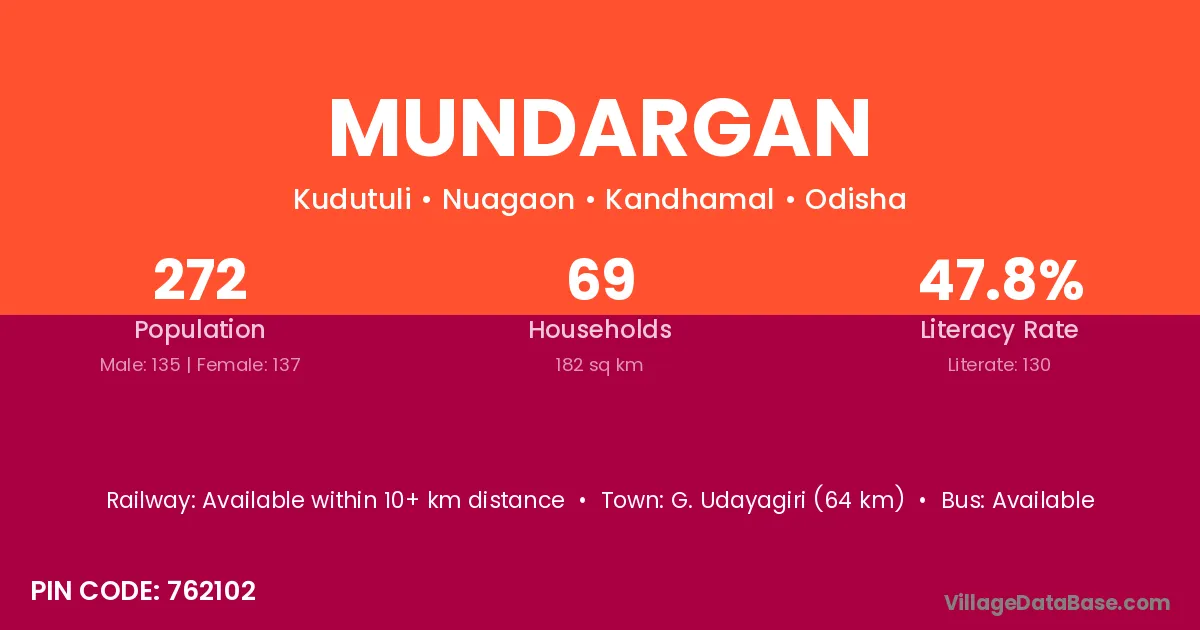 G. Udayagiri (64 km) is the nearest town to Mundargan village for major economic activities and is located approximately 64 km away.