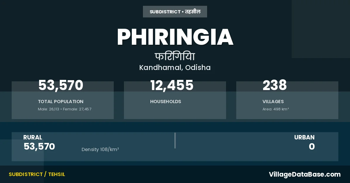 According to the 2011 census The total area of Phiringia Tehsil is 498 km², with a population of 53570 people. The population density is 108 inhabitants per square kilometre, and there are approximately 12455 houses in the sub district.