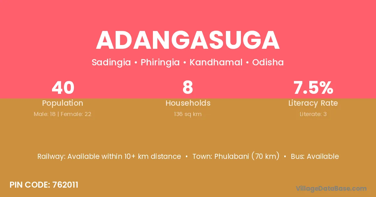 Phulabani (70 km) is the nearest town to Adangasuga village for major economic activities and is located approximately 70 km away.
