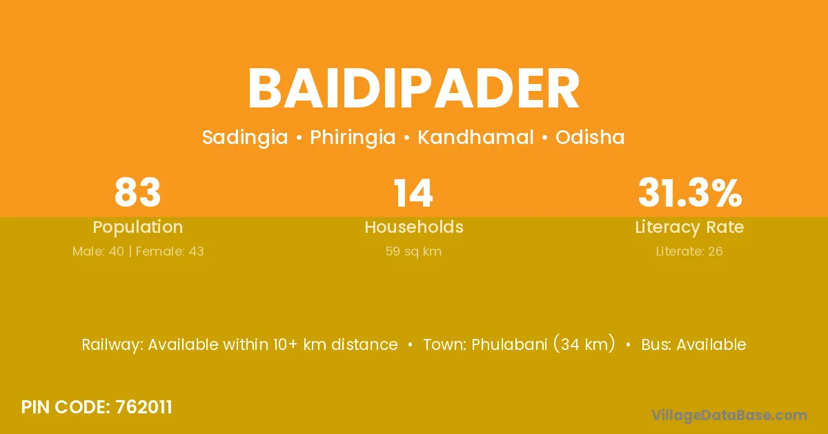 Phulabani (34 km) is the nearest town to Baidipader village for major economic activities and is located approximately 34 km away.