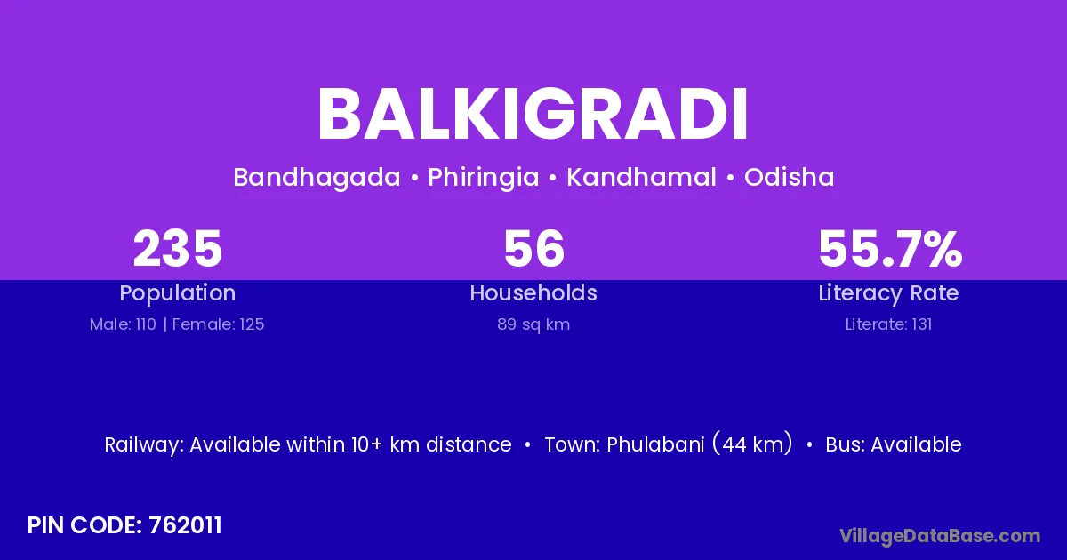 Phulabani (44 km) is the nearest town to Balkigradi village for major economic activities and is located approximately 44 km away.