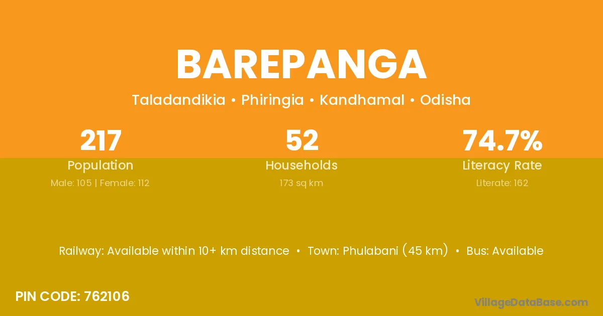 Phulabani (45 km) is the nearest town to Barepanga village for major economic activities and is located approximately 45 km away.