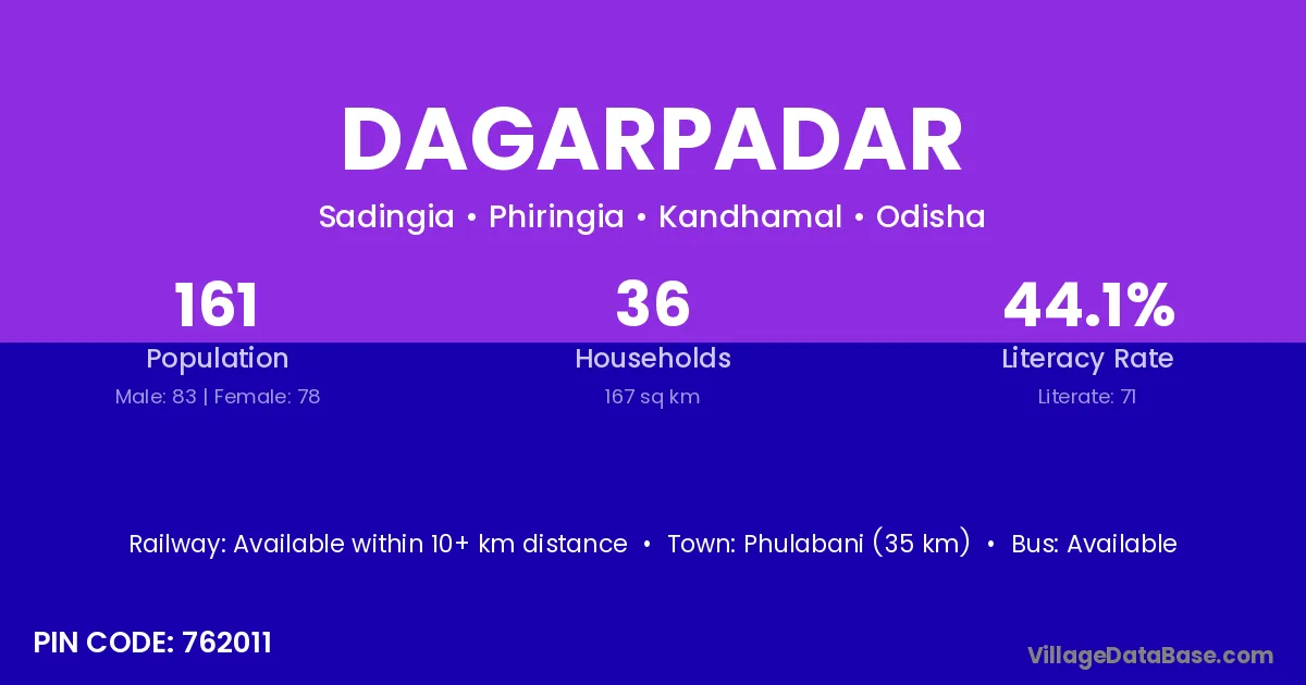 Phulabani (35 km) is the nearest town to Dagarpadar village for major economic activities and is located approximately 35 km away.
