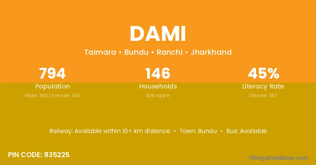 The literacy rate of Dami village is 35.09%. Male literacy stands at 56.52% and female literacy at 20.59%.