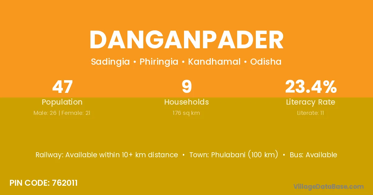 Phulabani (100 km) is the nearest town to Danganpader village for major economic activities and is located approximately 100 km away.