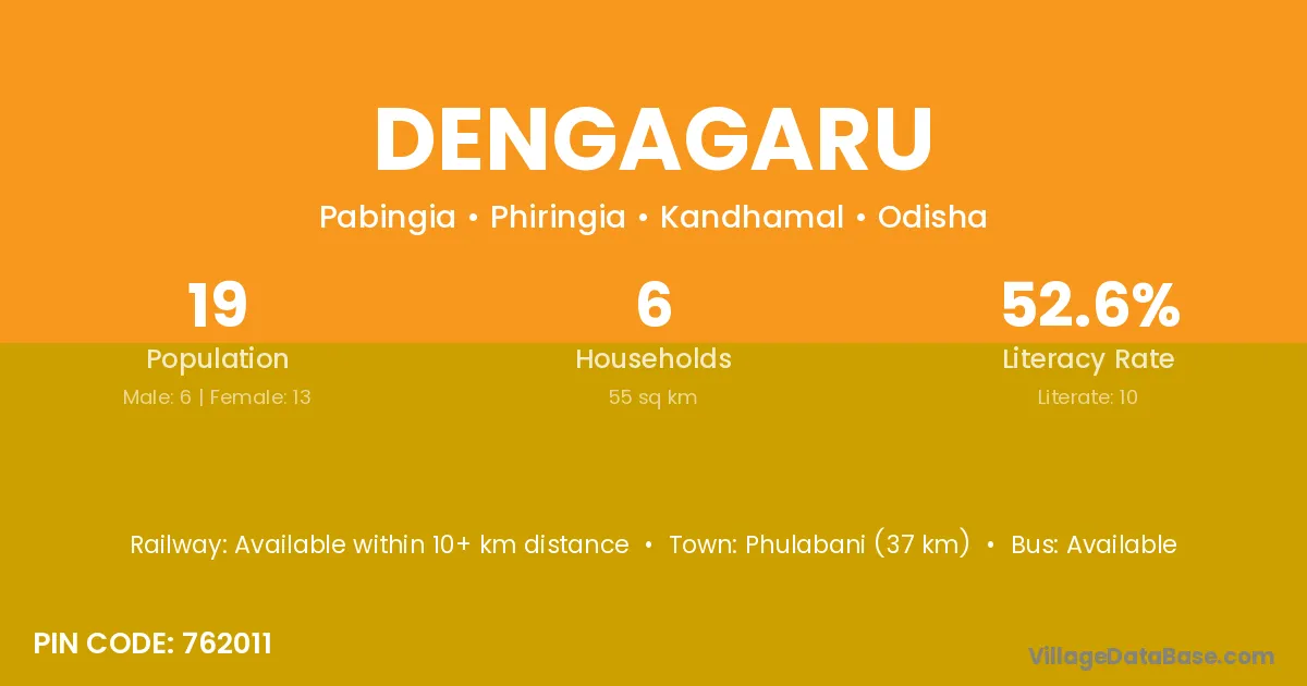 Phulabani (37 km) is the nearest town to Dengagaru village for major economic activities and is located approximately 37 km away.