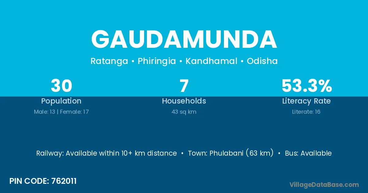 Phulabani (63 km) is the nearest town to Gaudamunda village for major economic activities and is located approximately 63 km away.