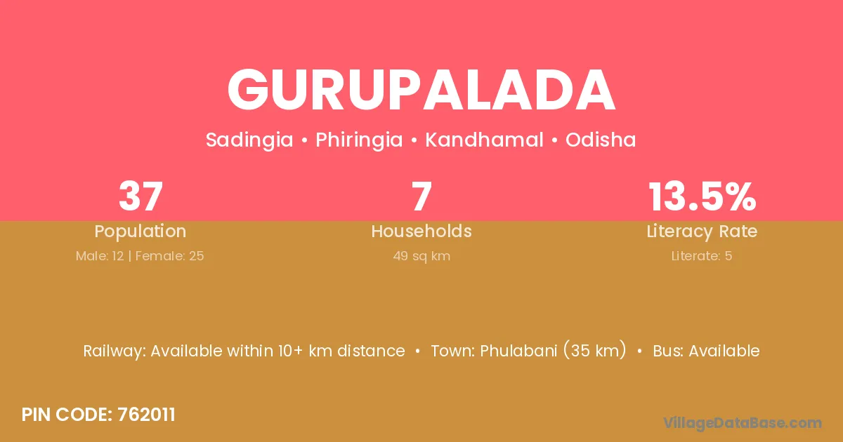 Phulabani (35 km) is the nearest town to Gurupalada village for major economic activities and is located approximately 35 km away.