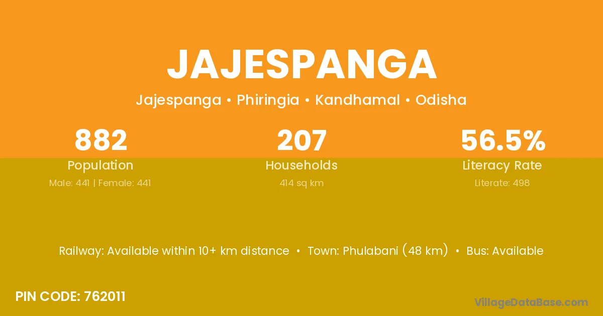 Phulabani (48 km) is the nearest town to Jajespanga village for major economic activities and is located approximately 48 km away.