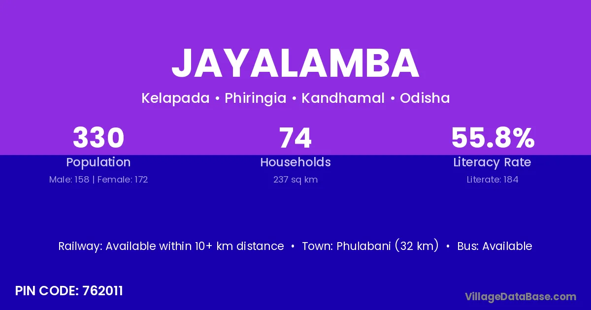 Phulabani (32 km) is the nearest town to Jayalamba village for major economic activities and is located approximately 32 km away.