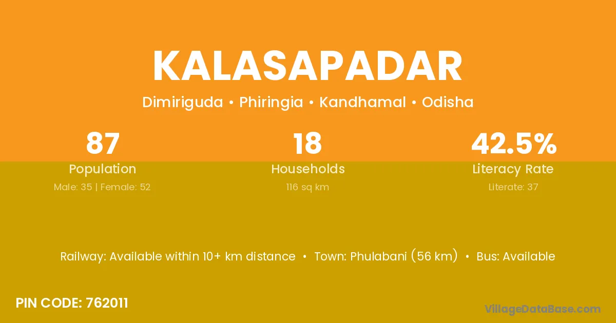 Phulabani (56 km) is the nearest town to Kalasapadar village for major economic activities and is located approximately 56 km away.
