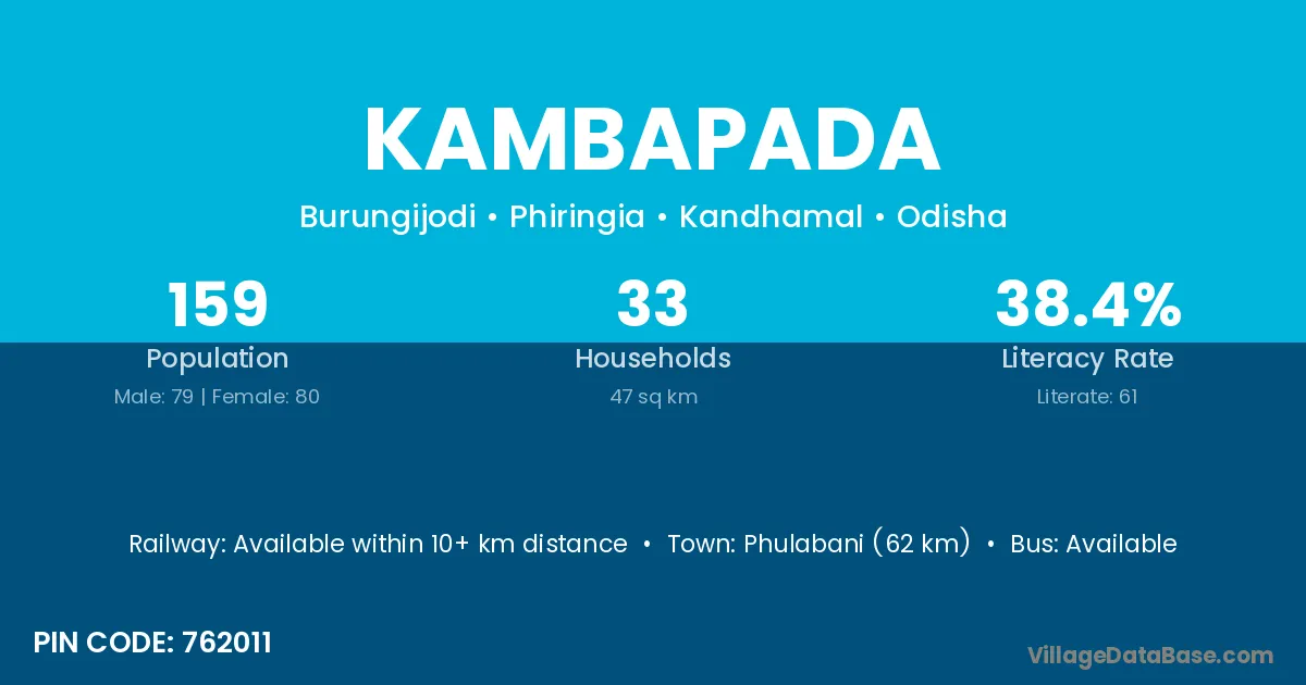 Phulabani (62 km) is the nearest town to Kambapada village for major economic activities and is located approximately 62 km away.