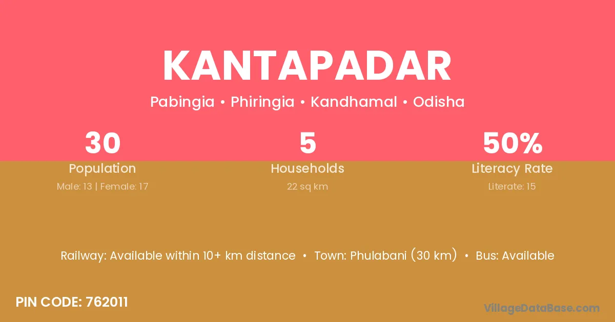 Phulabani (30 km) is the nearest town to Kantapadar village for major economic activities and is located approximately 30 km away.