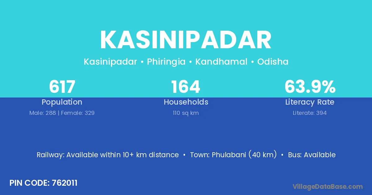 Phulabani (40 km) is the nearest town to Kasinipadar village for major economic activities and is located approximately 40 km away.
