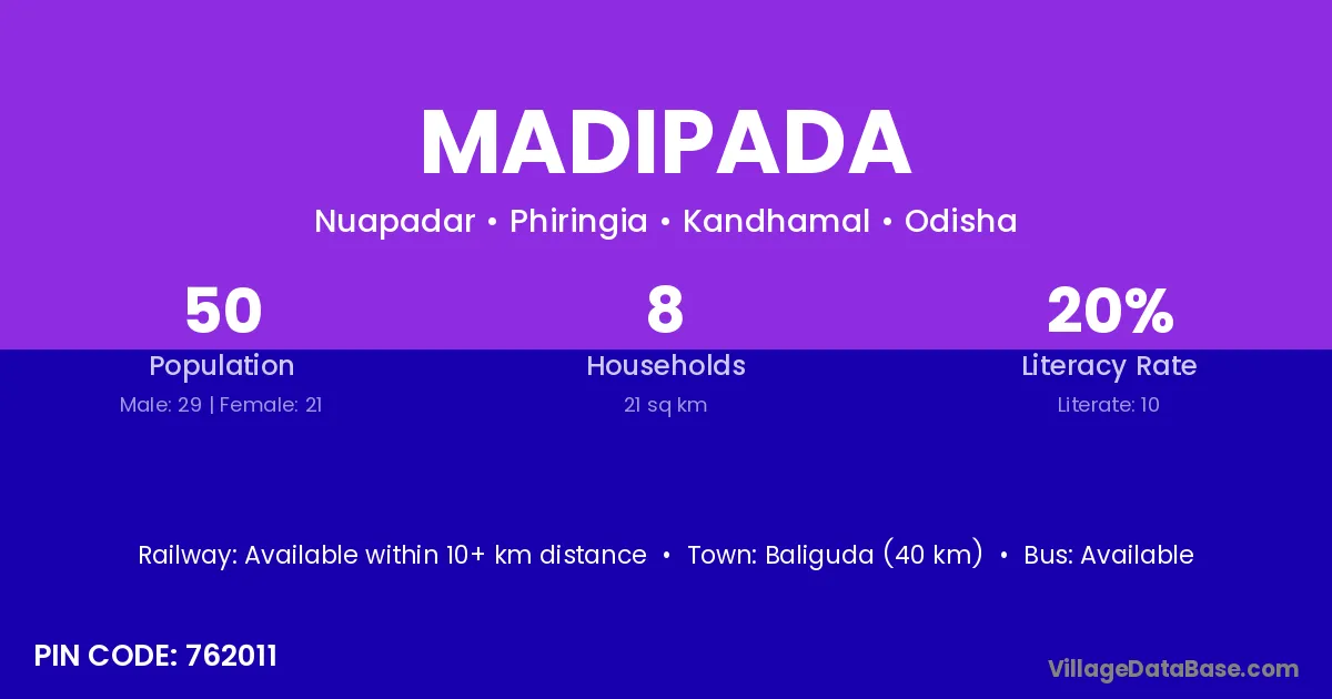 Baliguda (40 km) is the nearest town to Madipada village for major economic activities and is located approximately 40 km away.