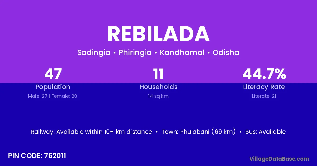Phulabani (69 km) is the nearest town to Rebilada village for major economic activities and is located approximately 69 km away.