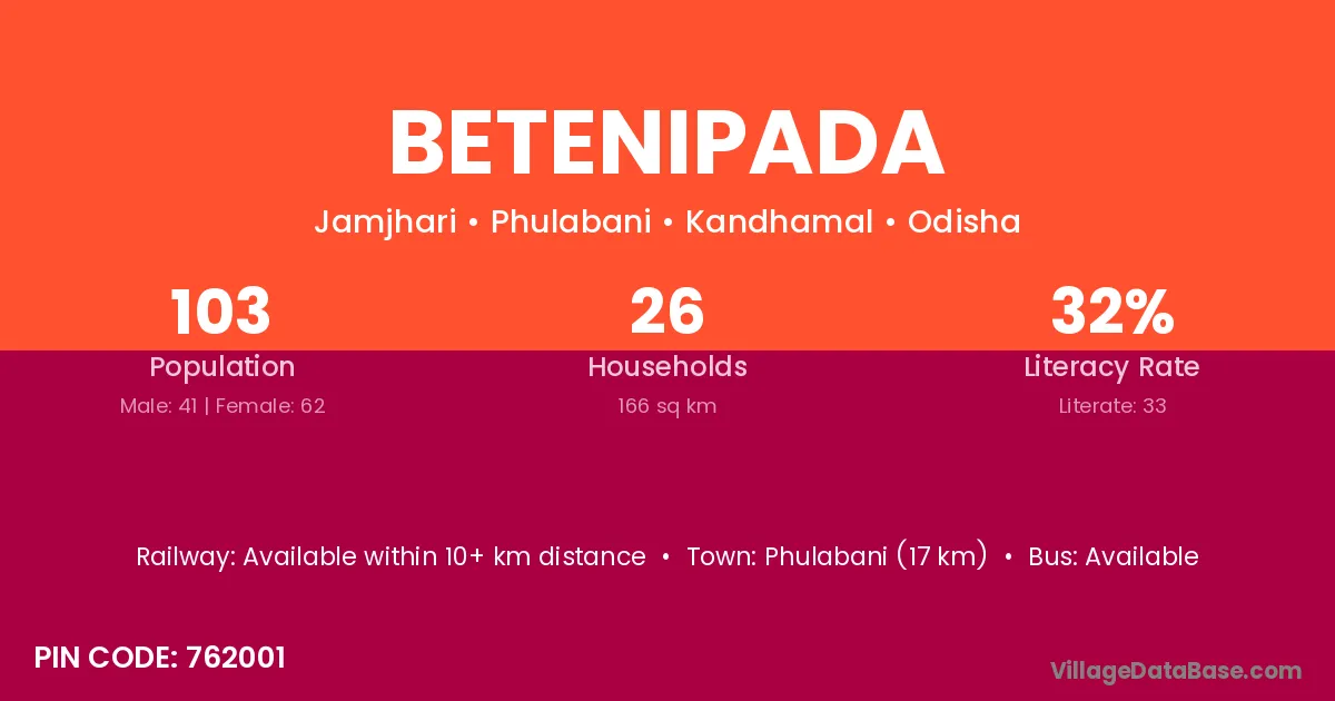 Phulabani (17 km) is the nearest town to Betenipada village for major economic activities and is located approximately 17 km away.