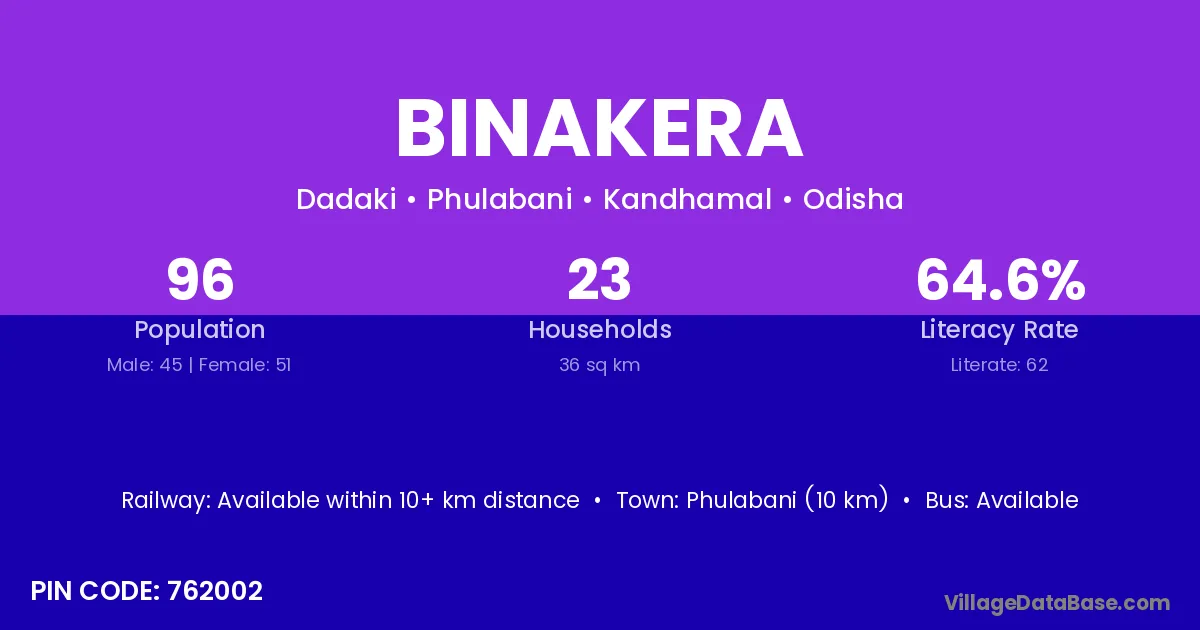 Phulabani (10 km) is the nearest town to Binakera village for major economic activities and is located approximately 10 km away.