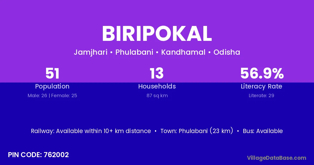 Phulabani (23 km) is the nearest town to Biripokal village for major economic activities and is located approximately 23 km away.