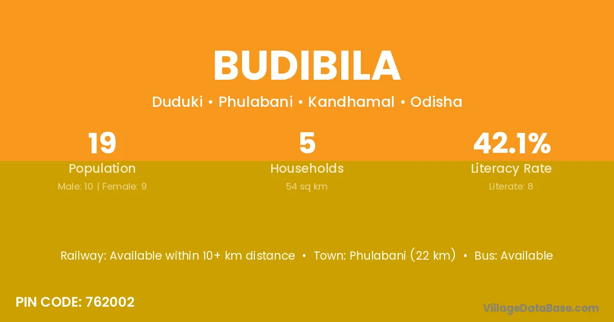 Phulabani (22 km) is the nearest town to Budibila village for major economic activities and is located approximately 22 km away.