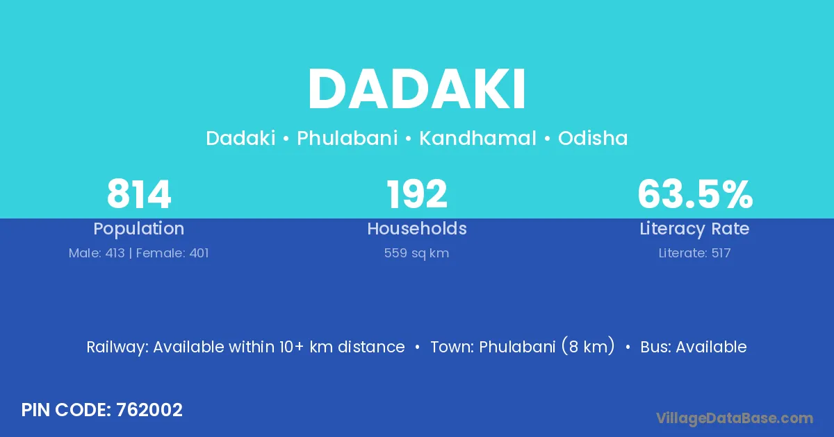 Phulabani (8 km) is the nearest town to Dadaki village for major economic activities and is located approximately 8 km away.