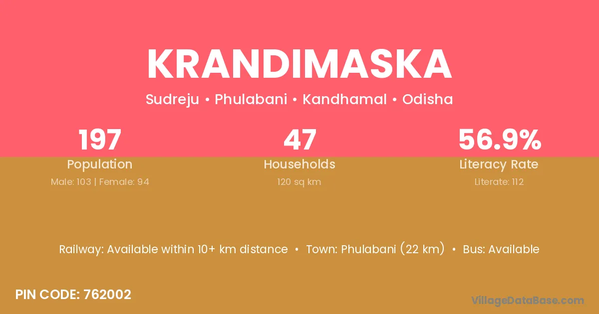 Phulabani (22 km) is the nearest town to Krandimaska village for major economic activities and is located approximately 22 km away.